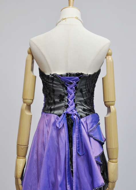 後ろでファスナーを閉めてから、編み上げで調節するスタイル。背面の編み上げ部分の紐がパープルでコントラストが丁度いい♪