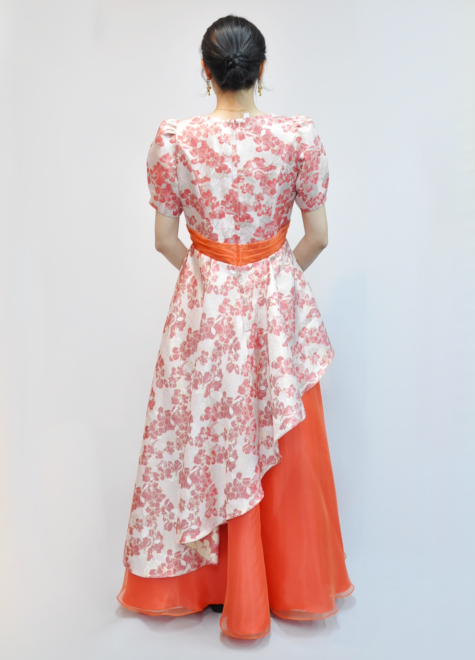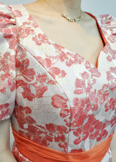 模様が立体的なジャガード織と、鮮やかなオレンジオーガンジー生地を組み合わせた1着。