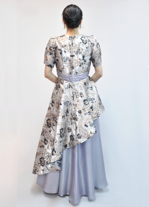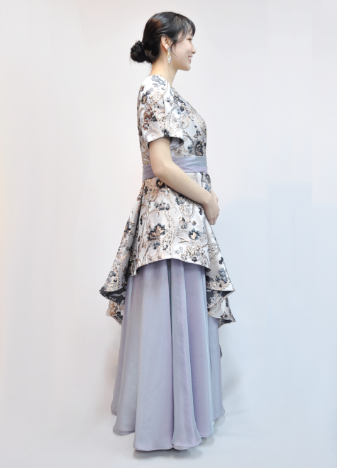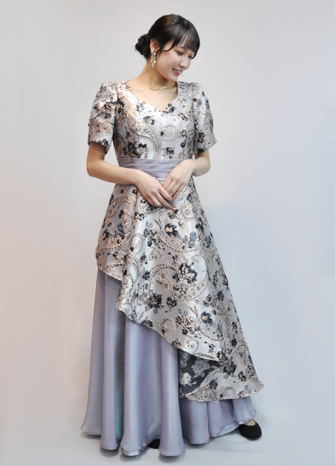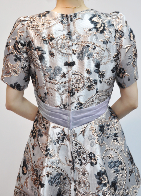 立体的ある模様が特徴的なジャガード織には、ブラックカラーの模様も入っており、ドレス全体が野暮ったくならない締め色として活躍。