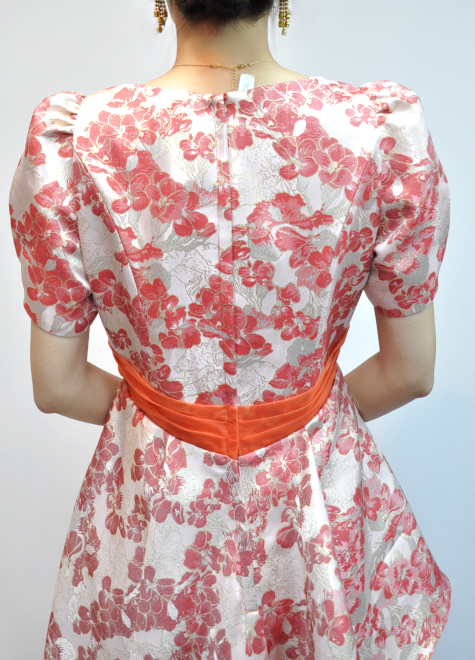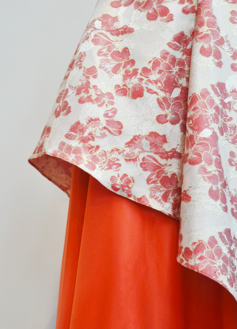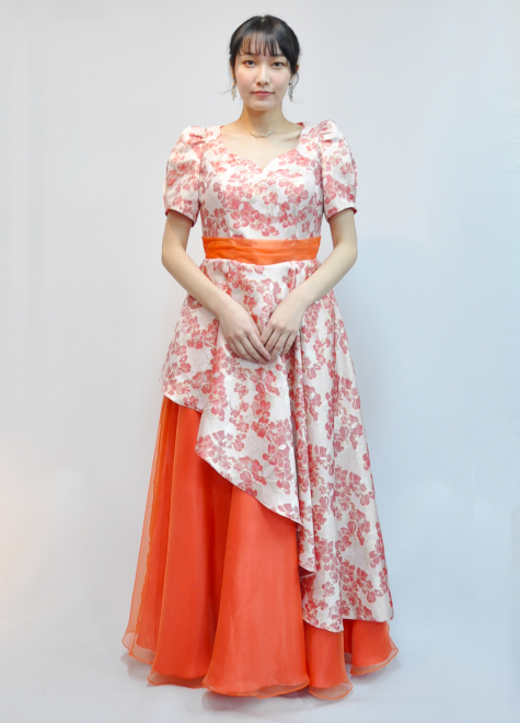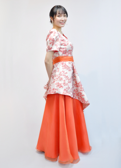 模様が立体的なジャガード織と鮮やかなオレンジオーガンジー生地を組み合わせた1着。