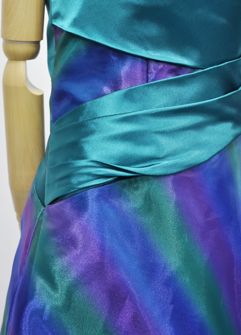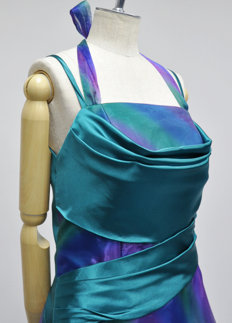 上半身のサテン生地は、オーガンジー生地との切り替えでメリハリを出し、胸元のドレープは上品さを、ウエストマークはウエストをほっそりと見せます。