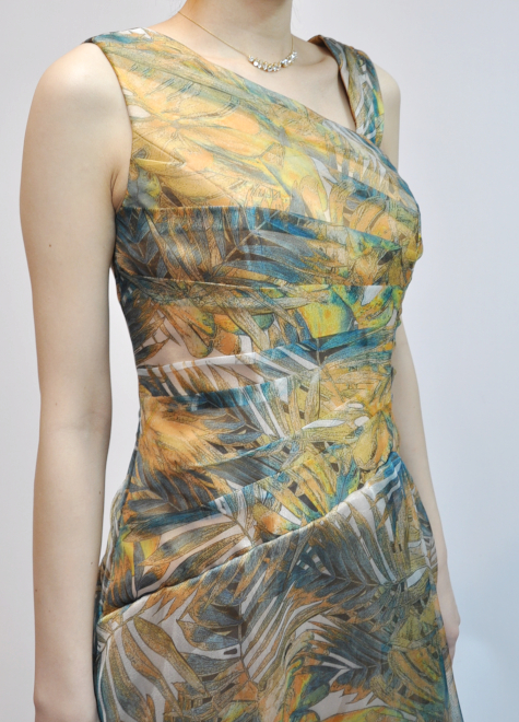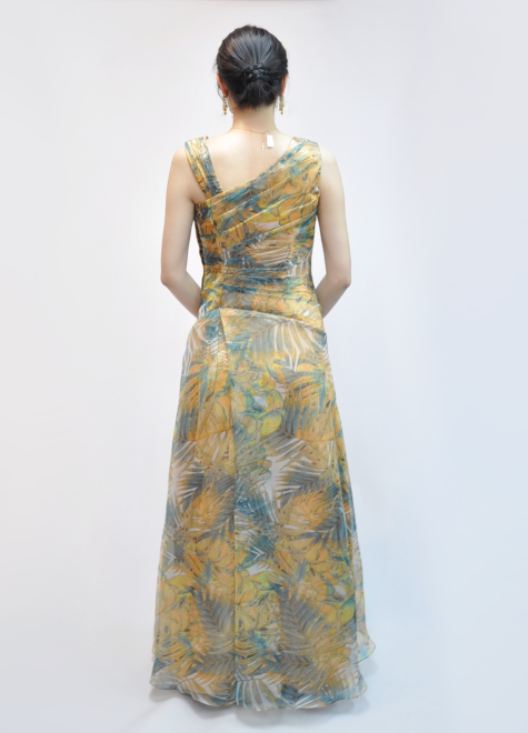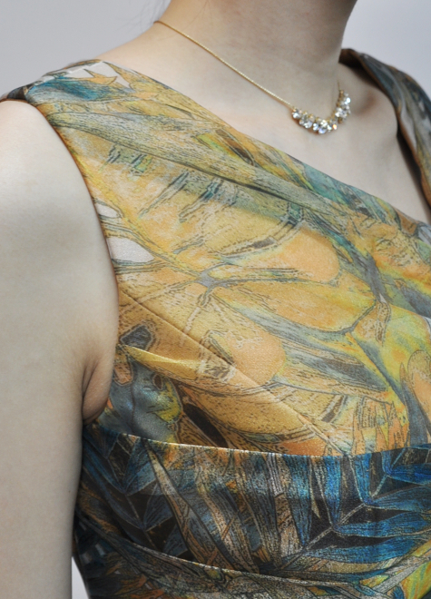 上半身は生地を折りたたむことで立体的になり、さらに発色良く、生地1枚では出せない複雑なカラーを作り出しました。照明の加減によって、カラーに変化が出るのも素敵です。