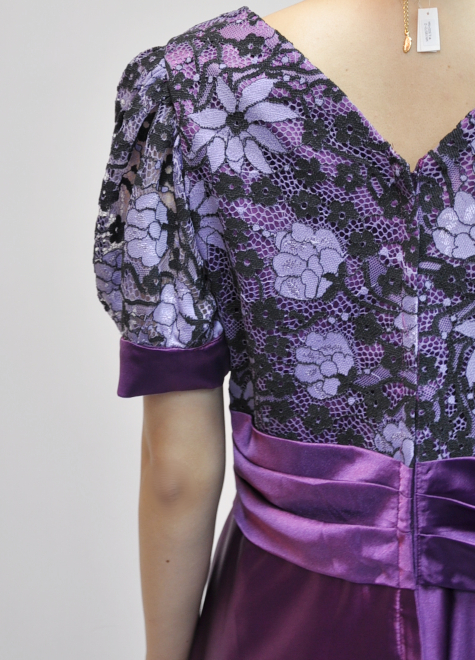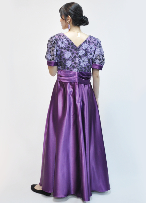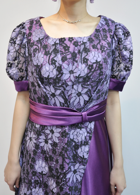 鮮やかなパープルサテンに、薄紫のレースに黒の花柄がワンポイントとなっています。