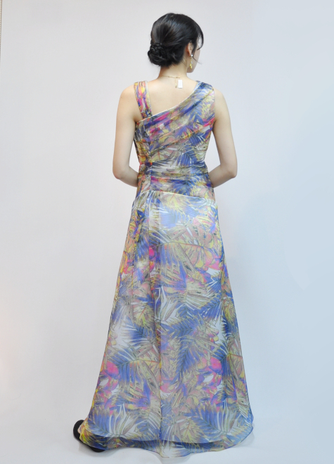 パープルをベースに、ビビットなピンクやイエローがワンポイントカラーとなっているオーガンジードレス。