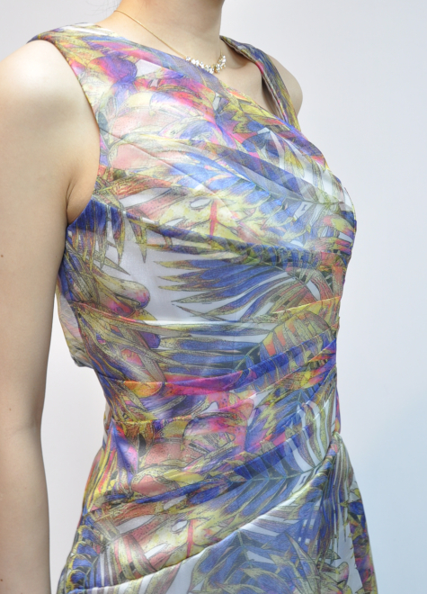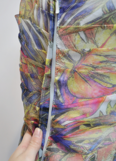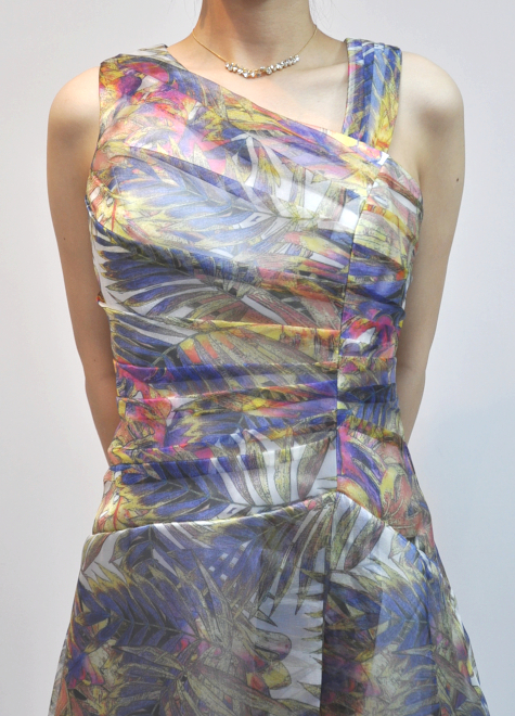 上半身は生地を折りたたむことで立体的になり、さらに発色良く、生地1枚では出せない複雑なカラーを作り出しました。照明の加減によって、カラーに変化が出るのも素敵です。裏地は表地カラーを邪魔しないホワイトグレーのサテン生地。