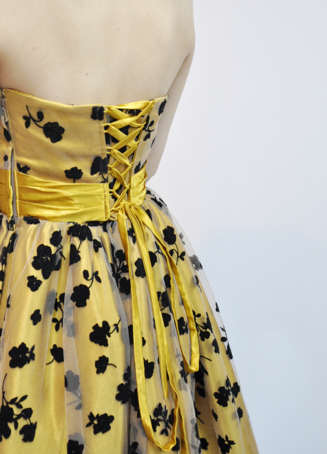 ベロア生地の花模様が、全体に散りばめられたかわいらしいビスチェドレス。