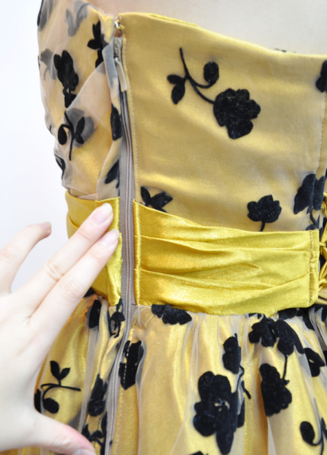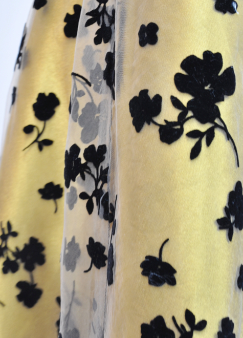裏地はラメ感のあるビビットなイエローで、一枚チュール生地を重ねてもくすまないカラーです。