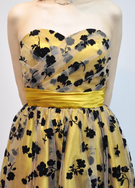 ベロア生地の花模様が、全体に散りばめられたかわいらしいビスチェドレス。