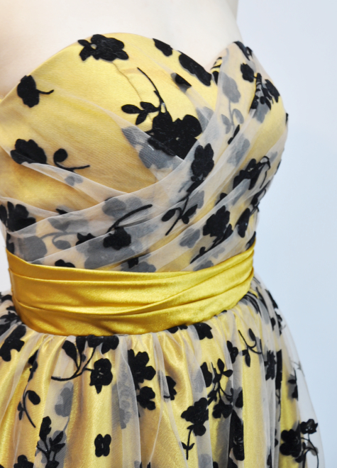 裏地はラメ感のあるビビットなイエローで、一枚チュール生地を重ねてもくすまないカラーです。