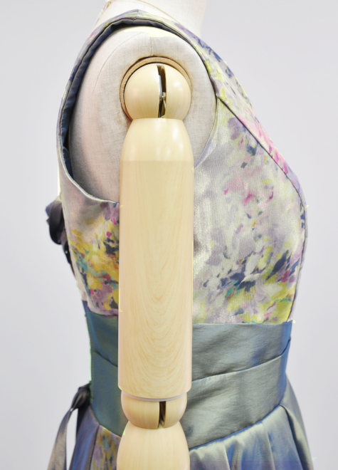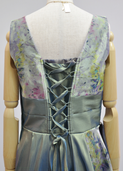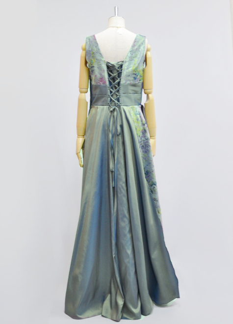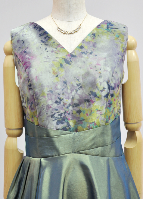 他のNo.1750のドレスと比べるとタフタ生地に特徴があり、反射次第で一部がブルーに見えるのが魅力的です。