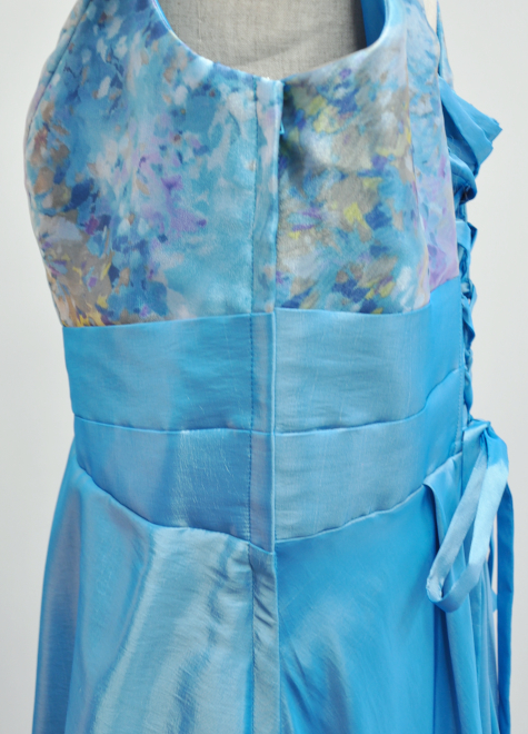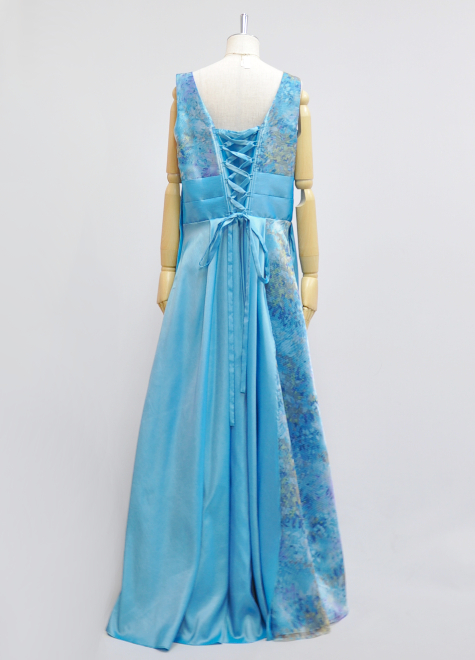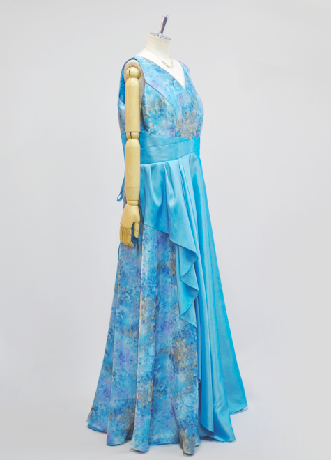 スカート部分は左右で見えるデザインが異なり、どちらもお楽しみいただけます。特にピアノを演奏される方ですと、側面を観客様へ見せる機会が多いかと思いますので右側をより立体的に動きのあるデザインに仕上げました。