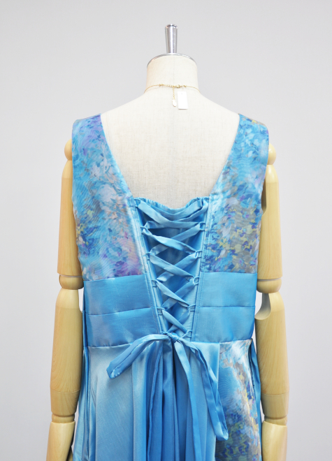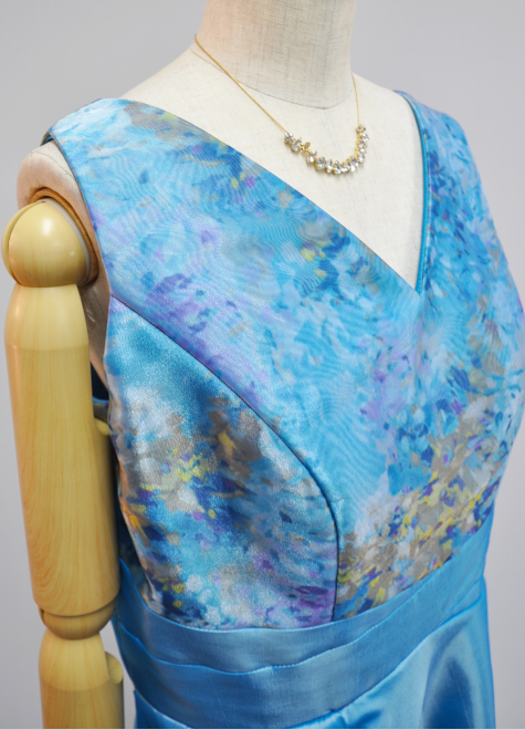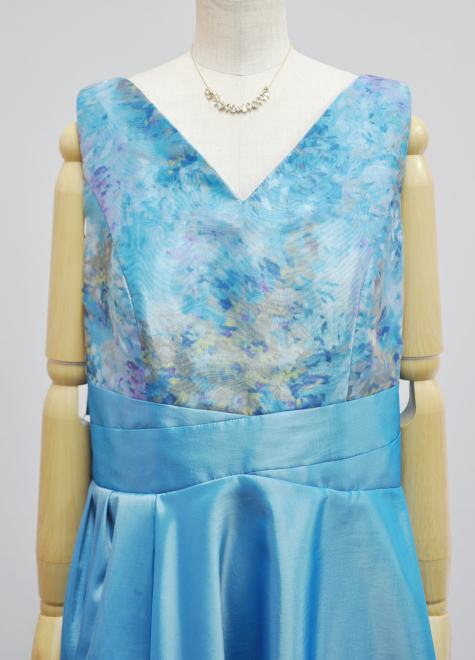 プリントオーガンジーの模様は水面に反射している花びらのようで、派手過ぎず落ち着きのある印象。