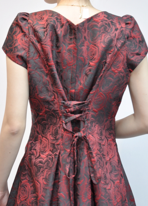 ブラックの生地に敷きつめられた、薔薇のデザインがとても印象的です。