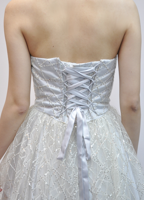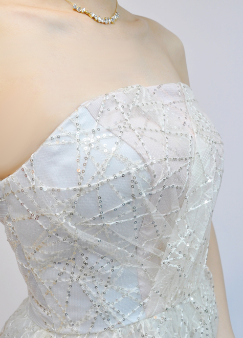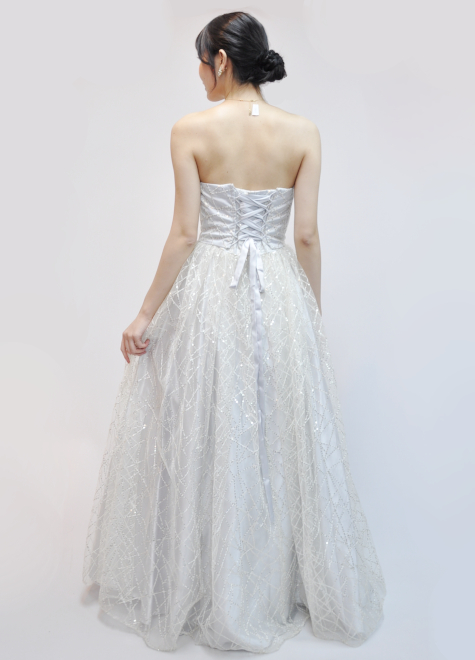 ドレス自体の色はグレーでありながら、オフホワイトのスパンコールチュールを表に被せることでドレス全体にはホワイトの印象を持ち、舞台を華やかに演出します。