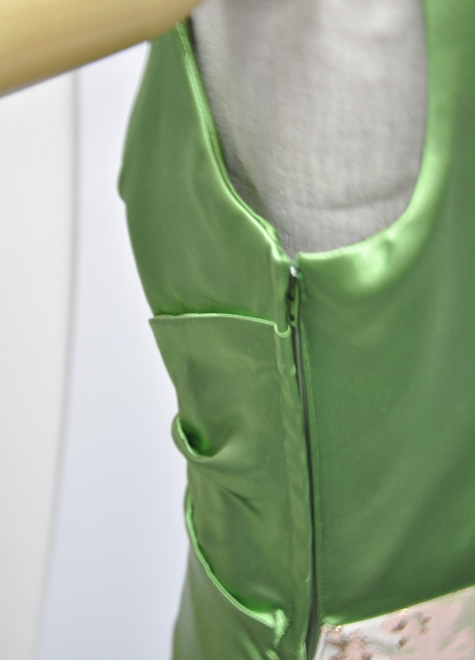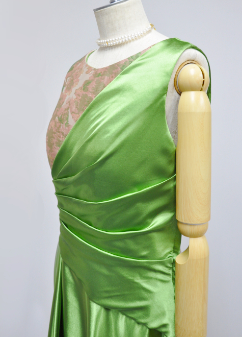 サテン生地を左胸から折りたたみながら右ウエストへまとめることで、どなたでもウエスト部分がはっきりし、メリハリのあるシルエットが出来ます!