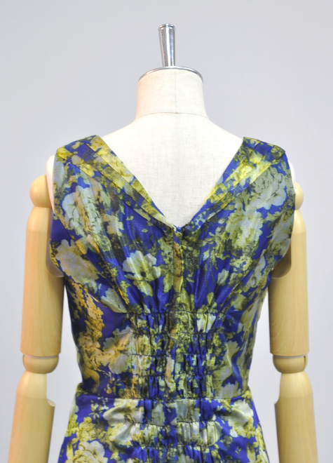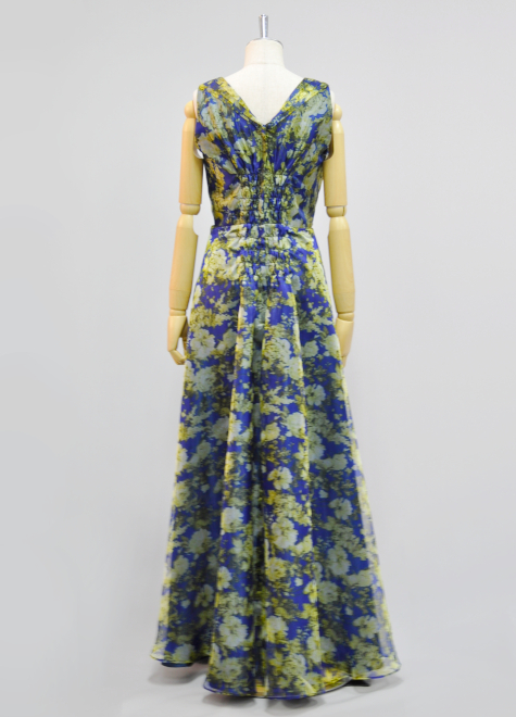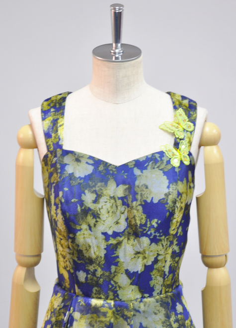 プリントオーガンジー生地は瑠璃色の下地の上にたっぷりと黄色の花をあしらったことで、