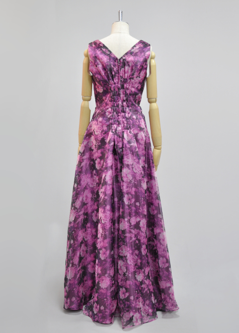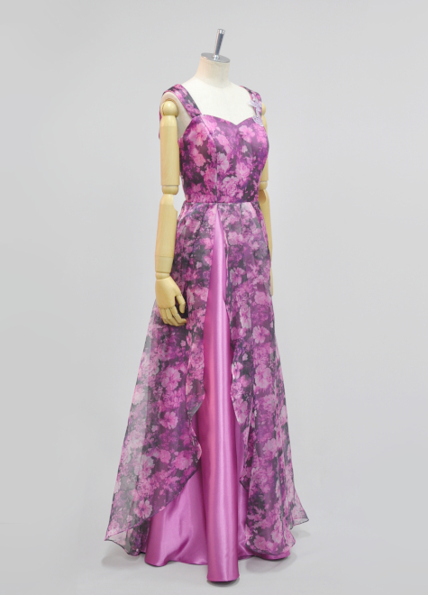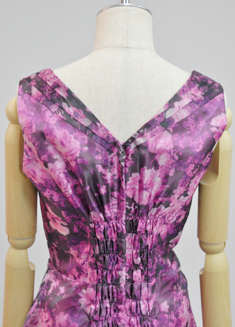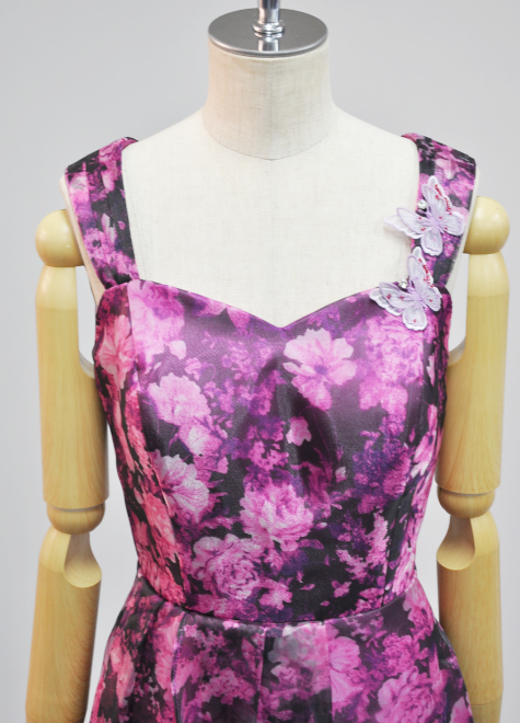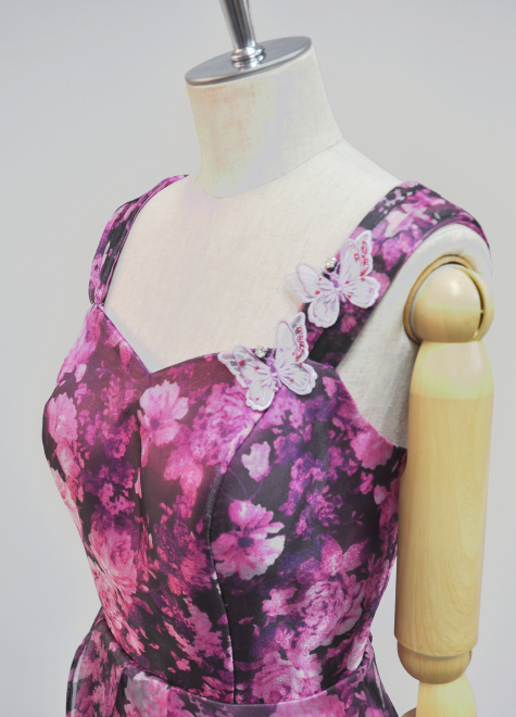 プリントオーガンジー生地は黒い下地の上にたっぷりとピンクの花をあしらい、可愛らしさを感じます。