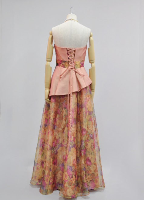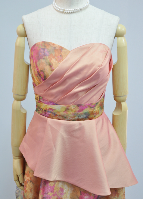 メインのプリントオーガンジー生地ドレスにサテン生地の組み合わせ。