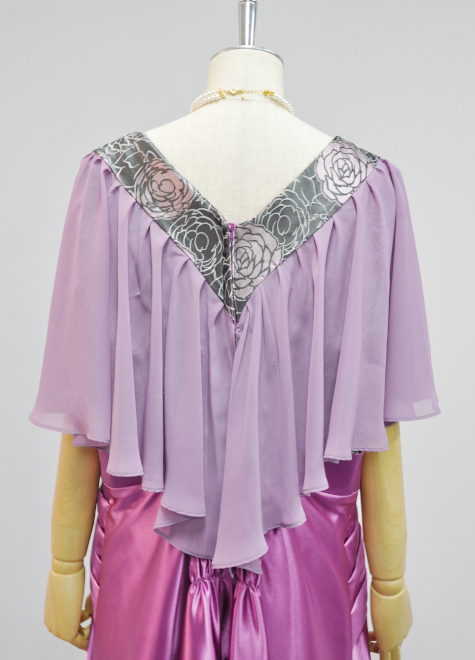ドレープで隠れていますが、背面はバックギャザー構造のため、動きやすくブレスしやすいのが特徴です。また可動域を制限しないシフォンのお袖も舞台向け。