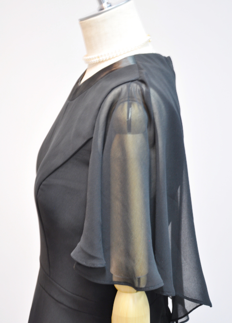 肩の動きを制限しない袖付きなので演奏を妨げられることなく二の腕を上品な透け感でカバーしてくれます。背面までつながっている袖は腕が動くたびにふんわりとなびくので、オーケストラの方々の楽器と相性◎