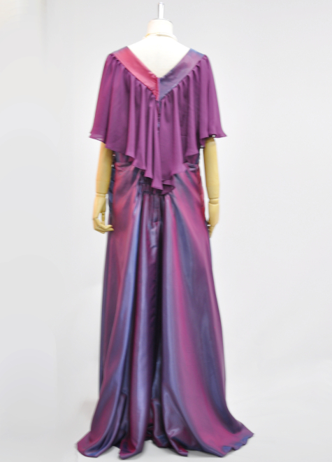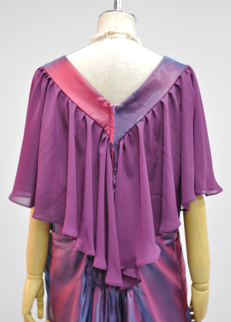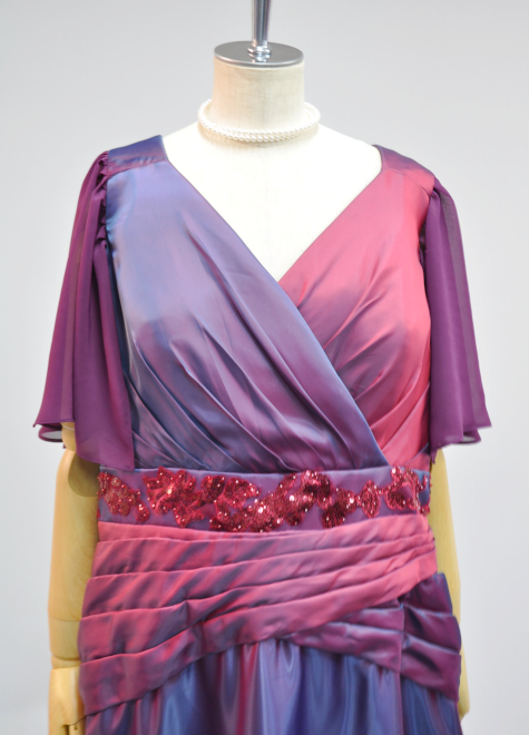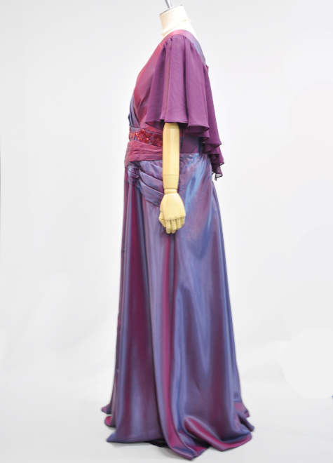 赤みのある紫っぽい色で全身をまとめた袖付きドレス。二種のタフタ生地をしているため、色の見え方が何通りもあるのを楽しめます♪