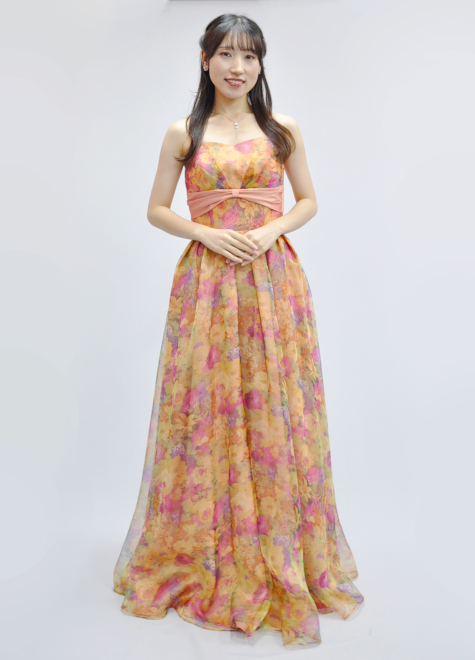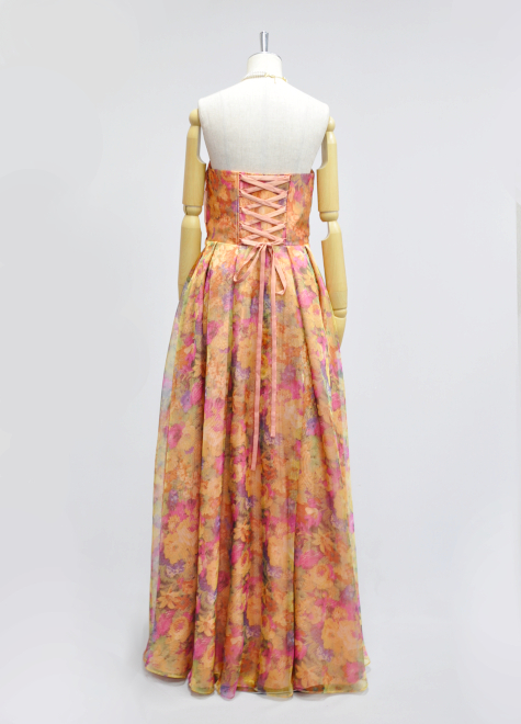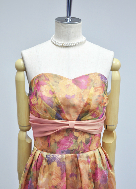 お花が色とりどりに散りばめられたオーガンジー生地が特徴的です。