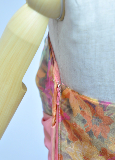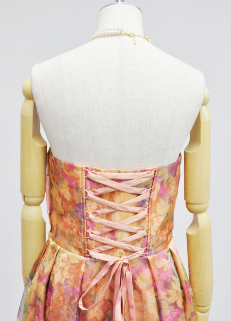 編み上げスタイルに左サイドファスナーを取り付け、脱ぎ着楽ちんスタイル。内側はゴムベルトを取り付け、ビスチェドレスでも安心仕様です。