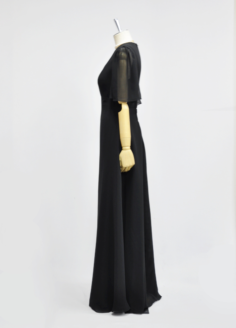パッと見は1726と似たようなデザインですが、ウエストの切り替えをアンダーバストにすることにより脚長効果とAラインの綺麗さがより目立ちます。襟元がすっきりしているのでどんなアクセサリーとも相性が良く、使い場所を選びません。