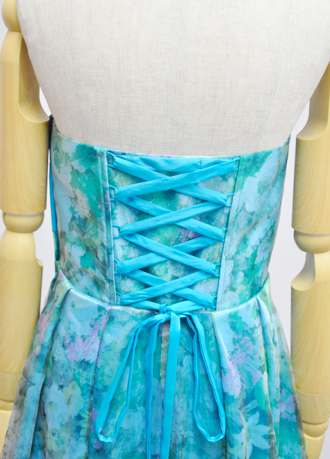 編み上げスタイルに左サイドファスナーを取り付け、脱ぎ着楽ちんスタイル。内側はゴムベルトを取り付け、ビスチェドレスでも安心仕様です。
