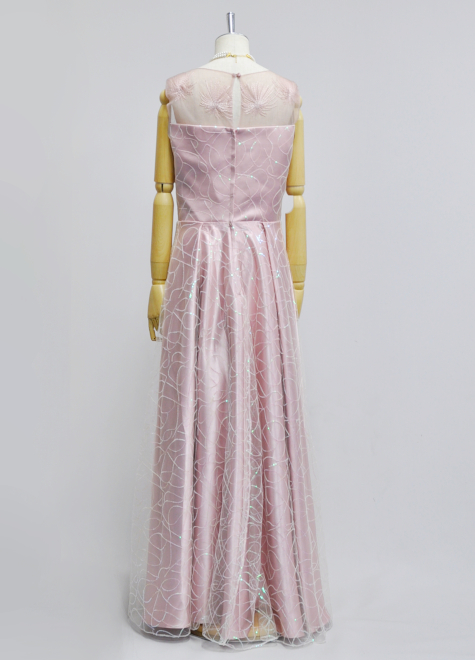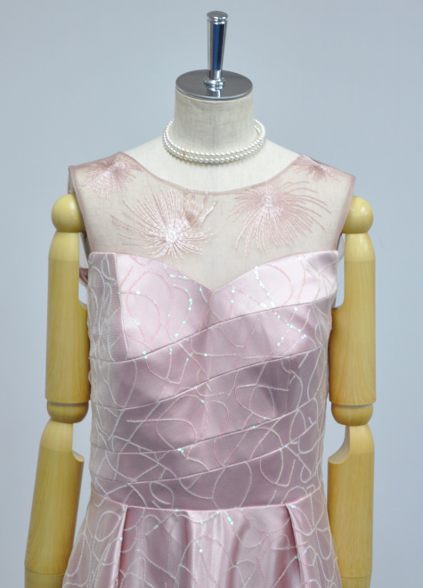 淡いマットサテン生地にスパンコールチュールをつけたドレスです。