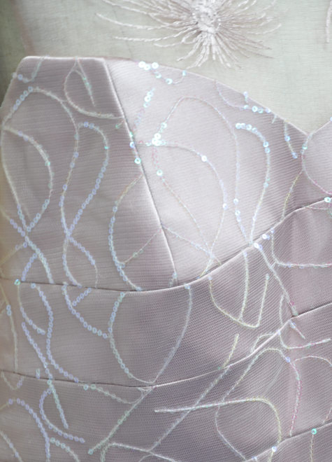 スカート部分では贅沢に裏地にマットサテン生地を使用し、スパンコールチュールを一枚かぶせました。