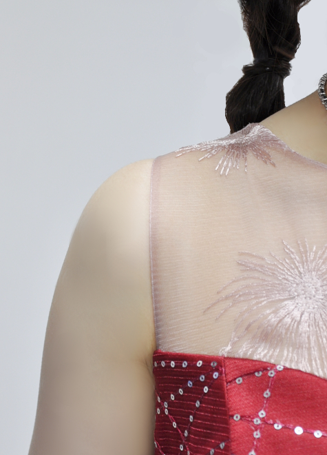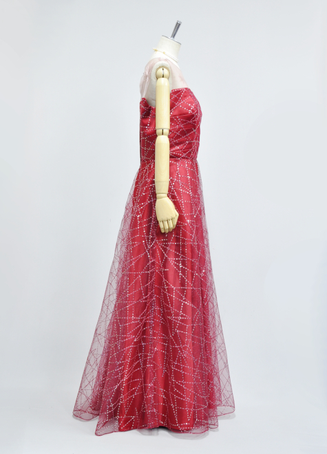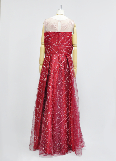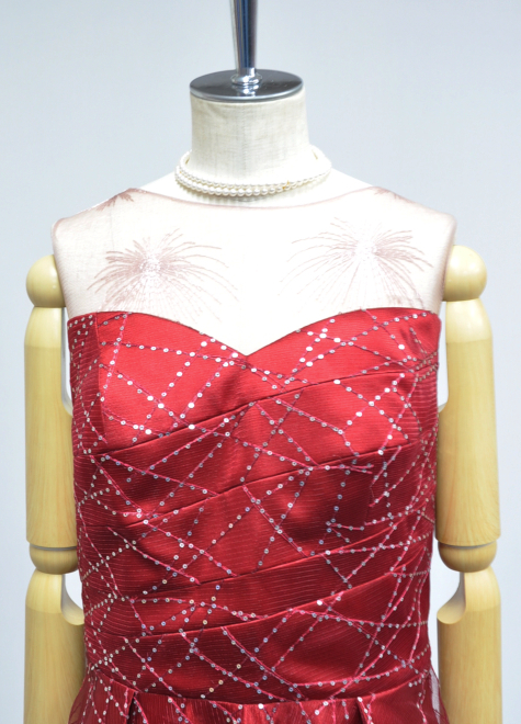 真っ赤なマットサテン生地にスパンコールチュールをつけた鮮やかなドレスです。