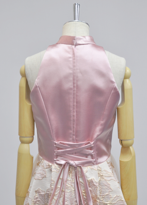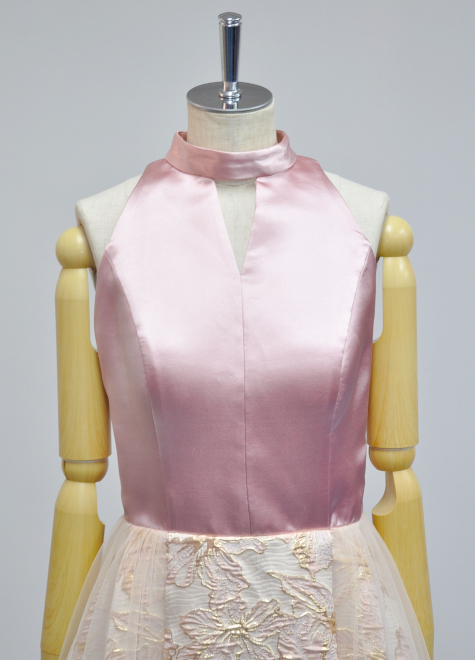 ホルターネックとアメリカンスリーブでスタイリッシュな印象に。