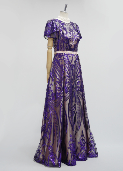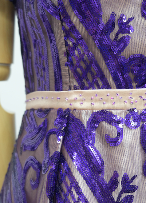 裏地にはクリーム色のサテン生地を、表地にはパープルのスパンコール生地を使用しております。