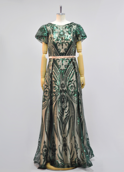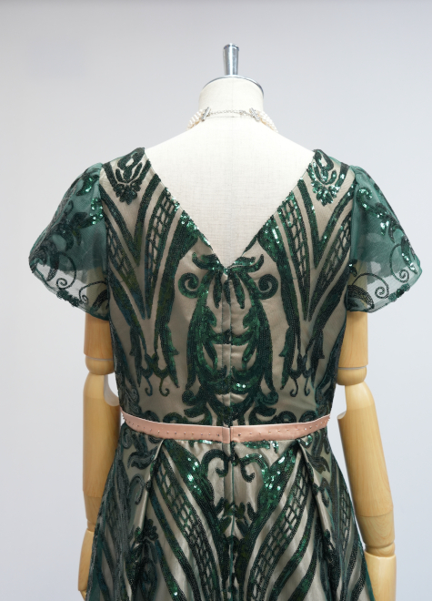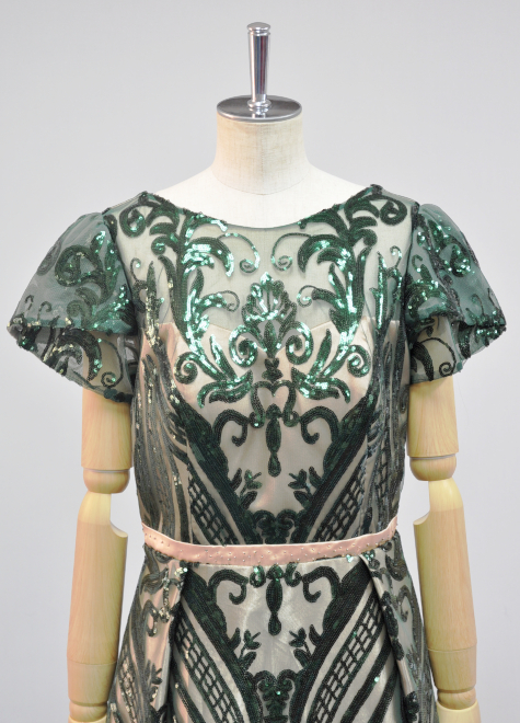 裏地にはクリーム色のサテン生地を、表地にはモスグリーンのスパンコール生地を使用しております。