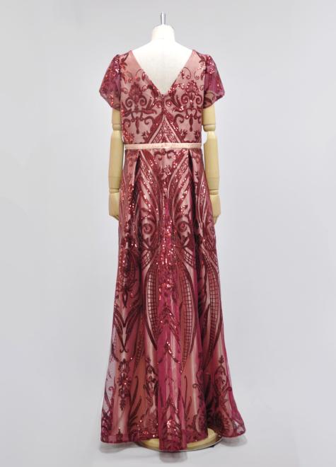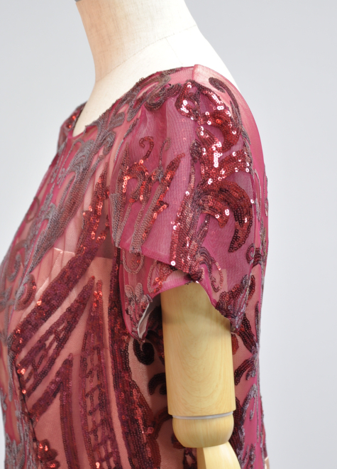 裏地にはクリーム色のサテン生地を、表地にはレッドのスパンコール生地を使用しております。