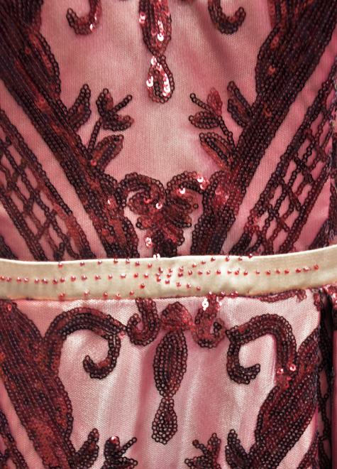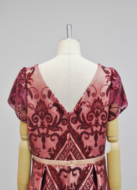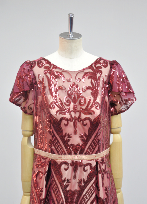 裏地にはクリーム色のサテン生地を、表地にはレッドのスパンコール生地を使用しております。
