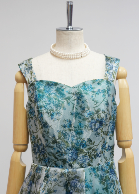 プリントオーガンジー生地は白く透けた生地に青い花がプリントされています。