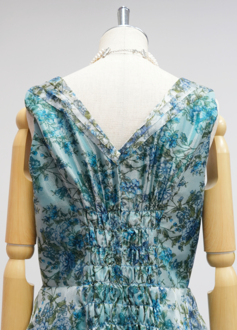 プリントオーガンジー生地は白く透けた生地に青い花がプリントされています。