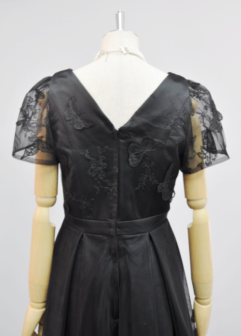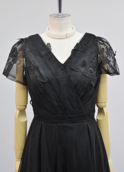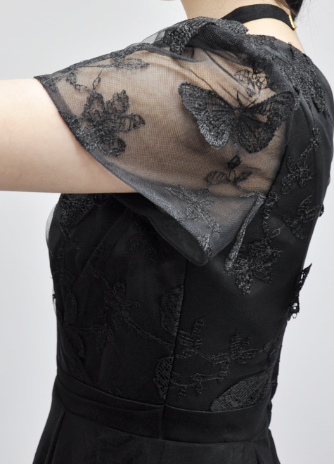 身頃は蝶々の刺しゅうがついたチュール生地を均一に折りたたみ、