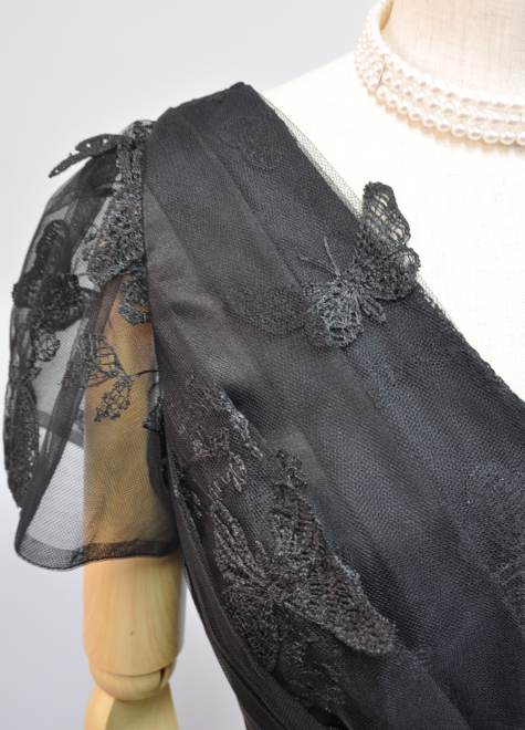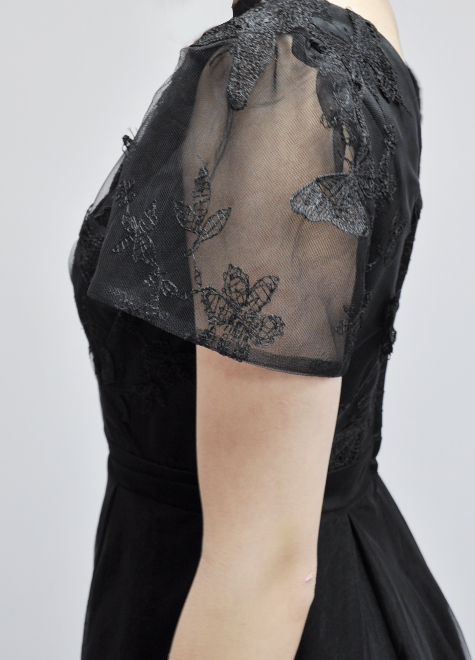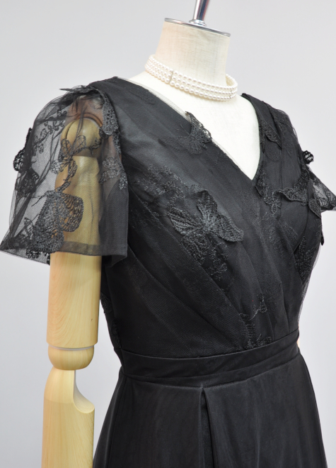 身頃は蝶々の刺しゅうがついたチュール生地を均一に折りたたみ、
