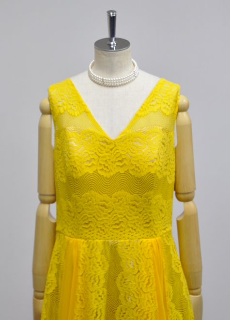 スカート部分には四か所にイエローのシフォン生地を差し込み、生地の違いが飽きないデザインになっております。
