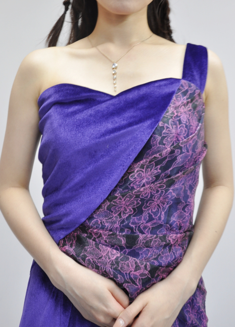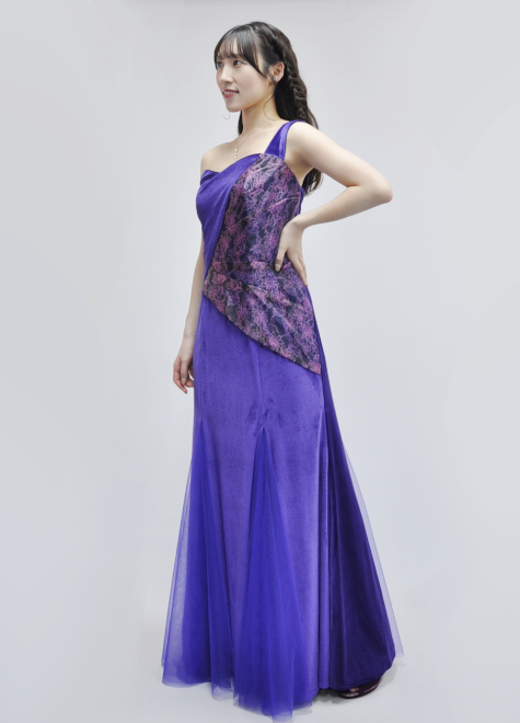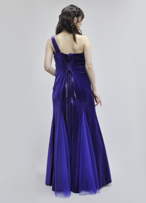 表裏でベロアの色を変え、プリントオーガンジーによる上半身のデザインによって飽きのこないドレスです。