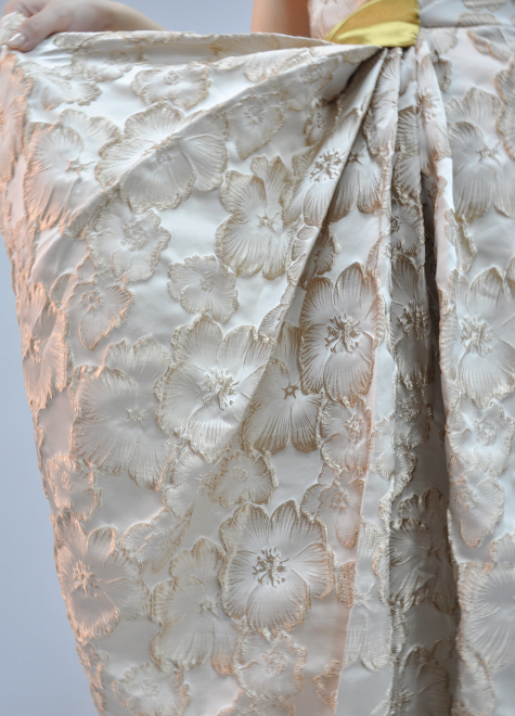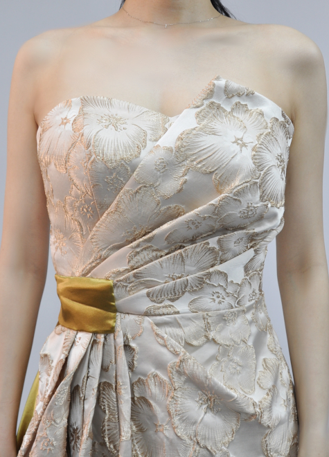 バスト~ウエストのジャガード生地を折り畳んで右サイドへ集めたデザインでウエストが強調されます。