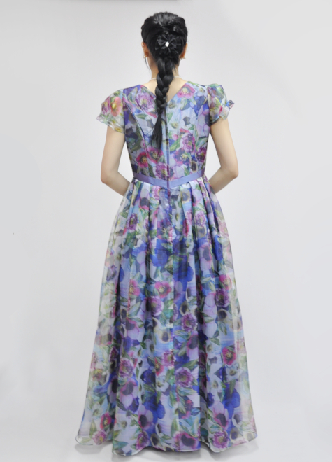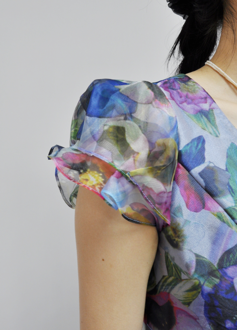 フリルの袖とスカート部分のオーガンジーの広がりによって、より一層ウエストが細見えし、ウエストマークとの相乗効果で形にメリハリがあります。
