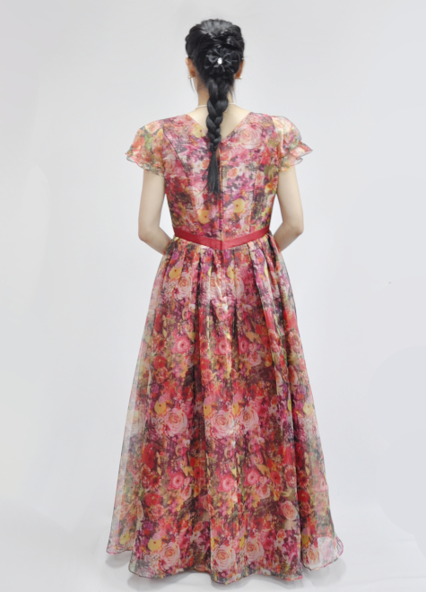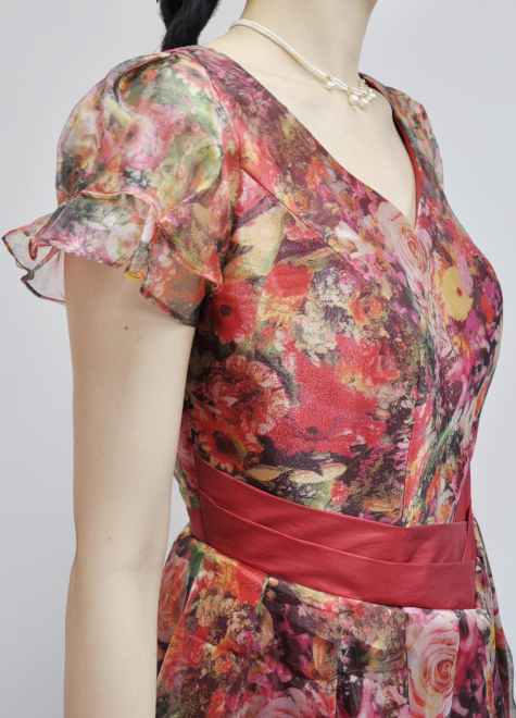 全体的にレッドを中心としたカラーを持った花柄プリントオーガンジーを使用し、温かみのある雰囲気