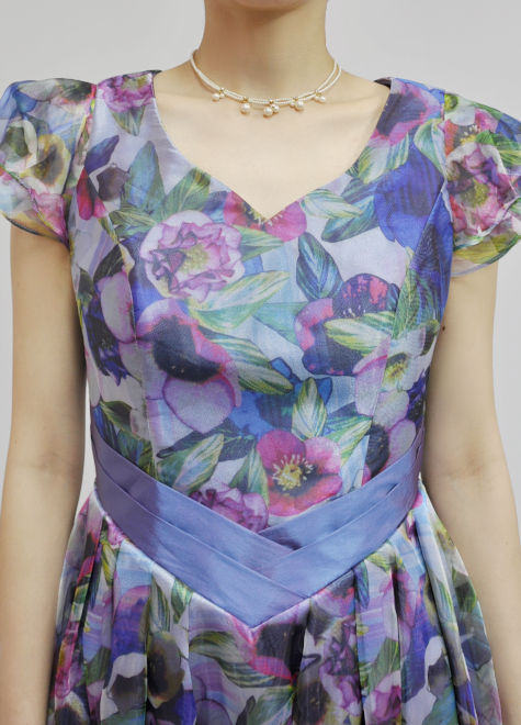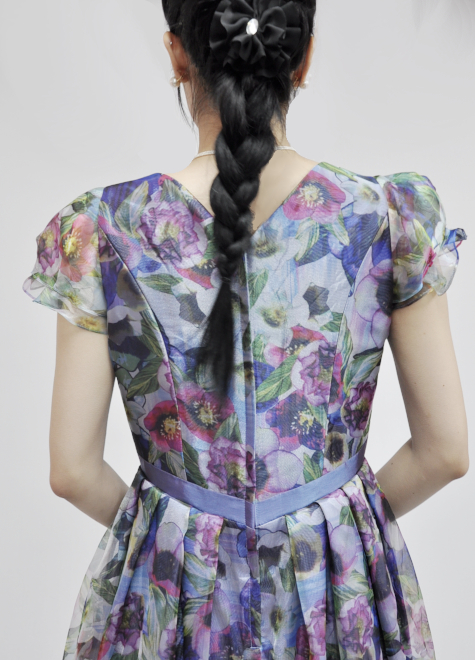 フリルの袖とスカート部分のオーガンジーの広がりによって、より一層ウエストが細見えし、ウエストマークとの相乗効果で形にメリハリがあります。