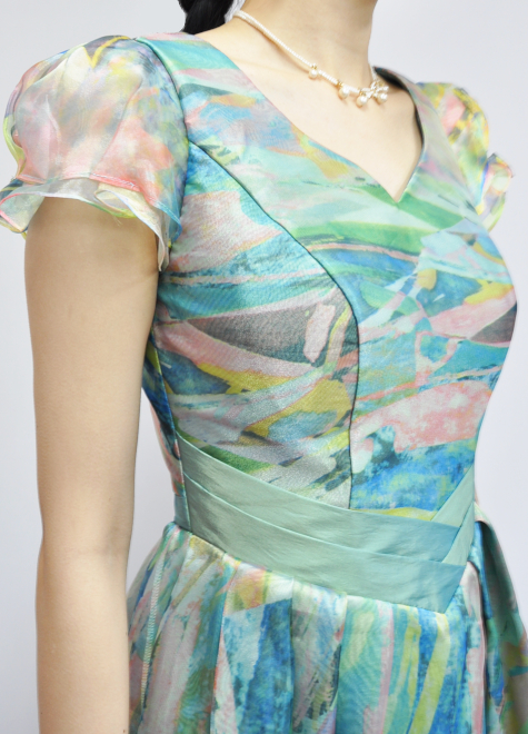 フリルの袖とスカート部分のオーガンジーの広がりによって、より一層ウエストが細見えし、ウエストマークとの相乗効果で形にメリハリがあります。