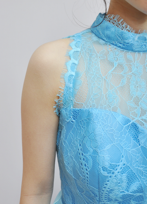 後ろの肩から肩甲骨までは、レース生地のみでさりげない肌見せ。