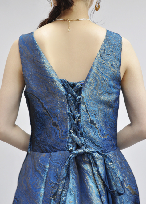 表面のジャガード織は紺色の中に黒とゴルードが時々入り混じり、大人かわいくどこかシックな印象もある1着、色は紺色とグリーンの混合です。